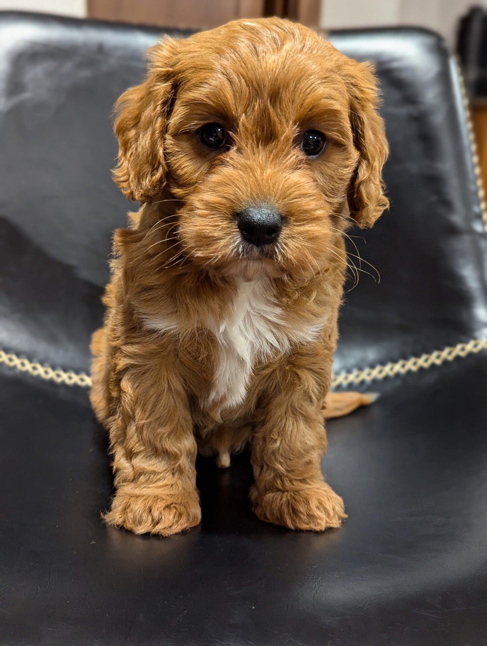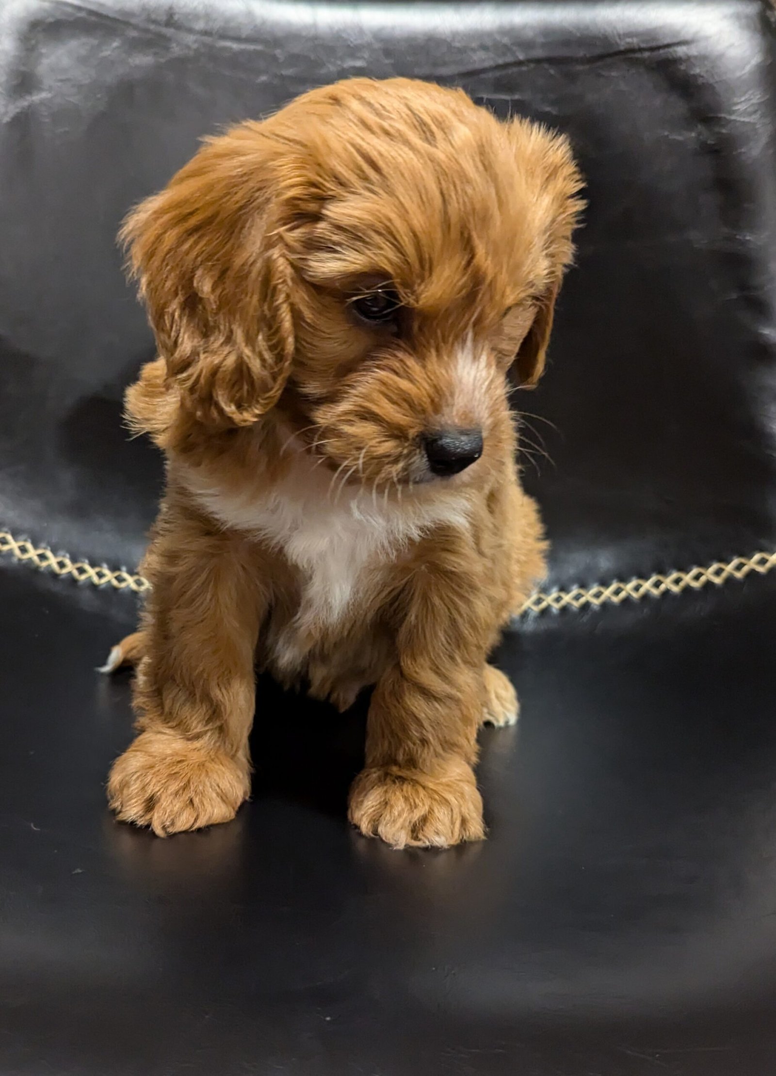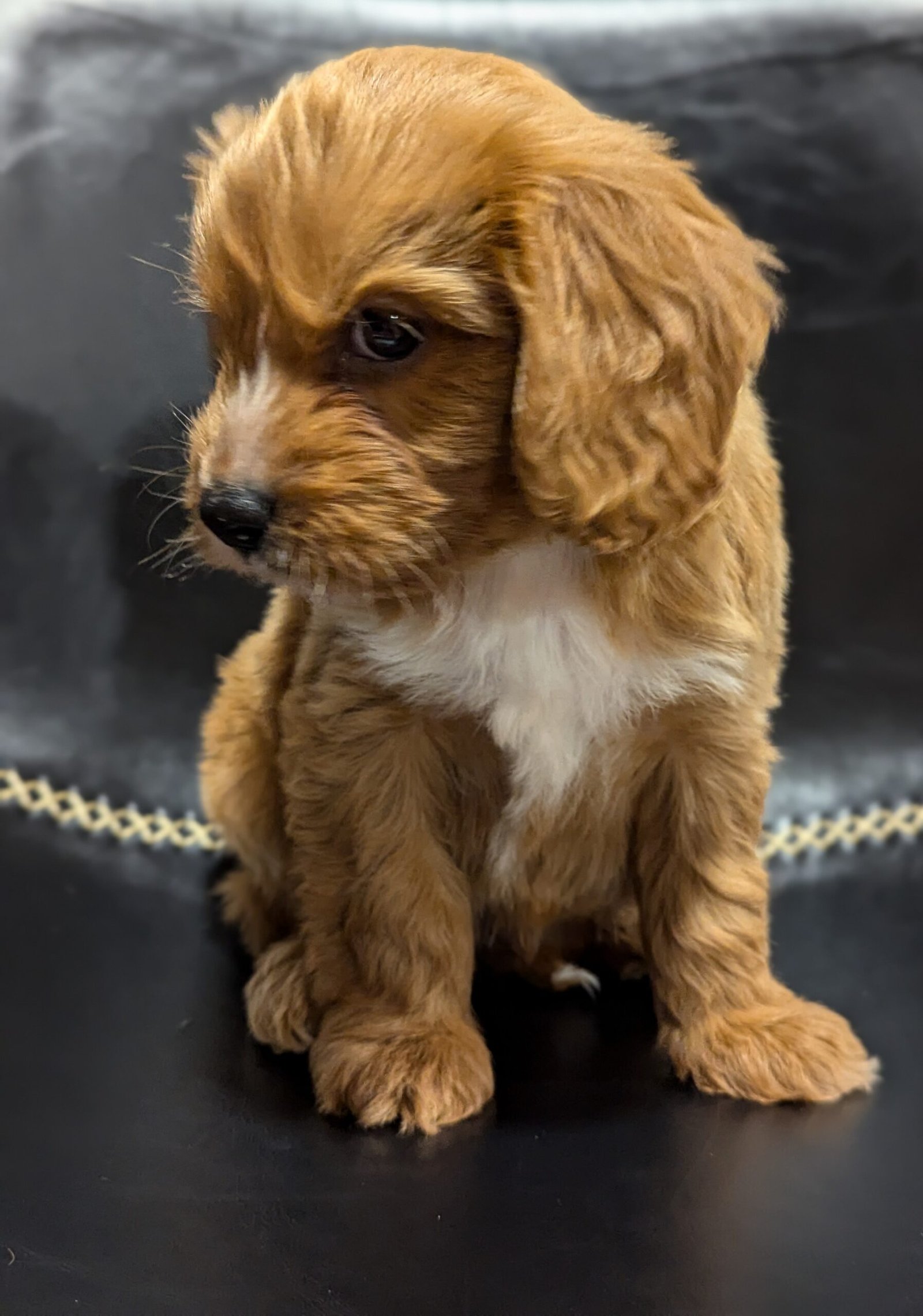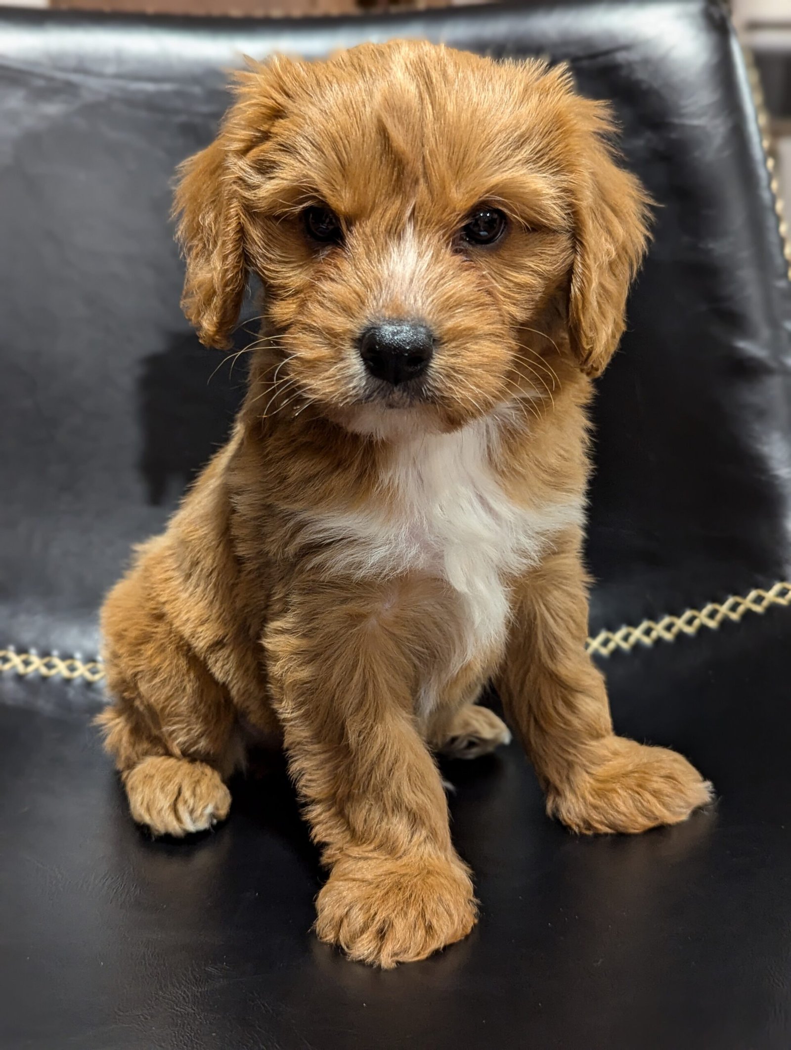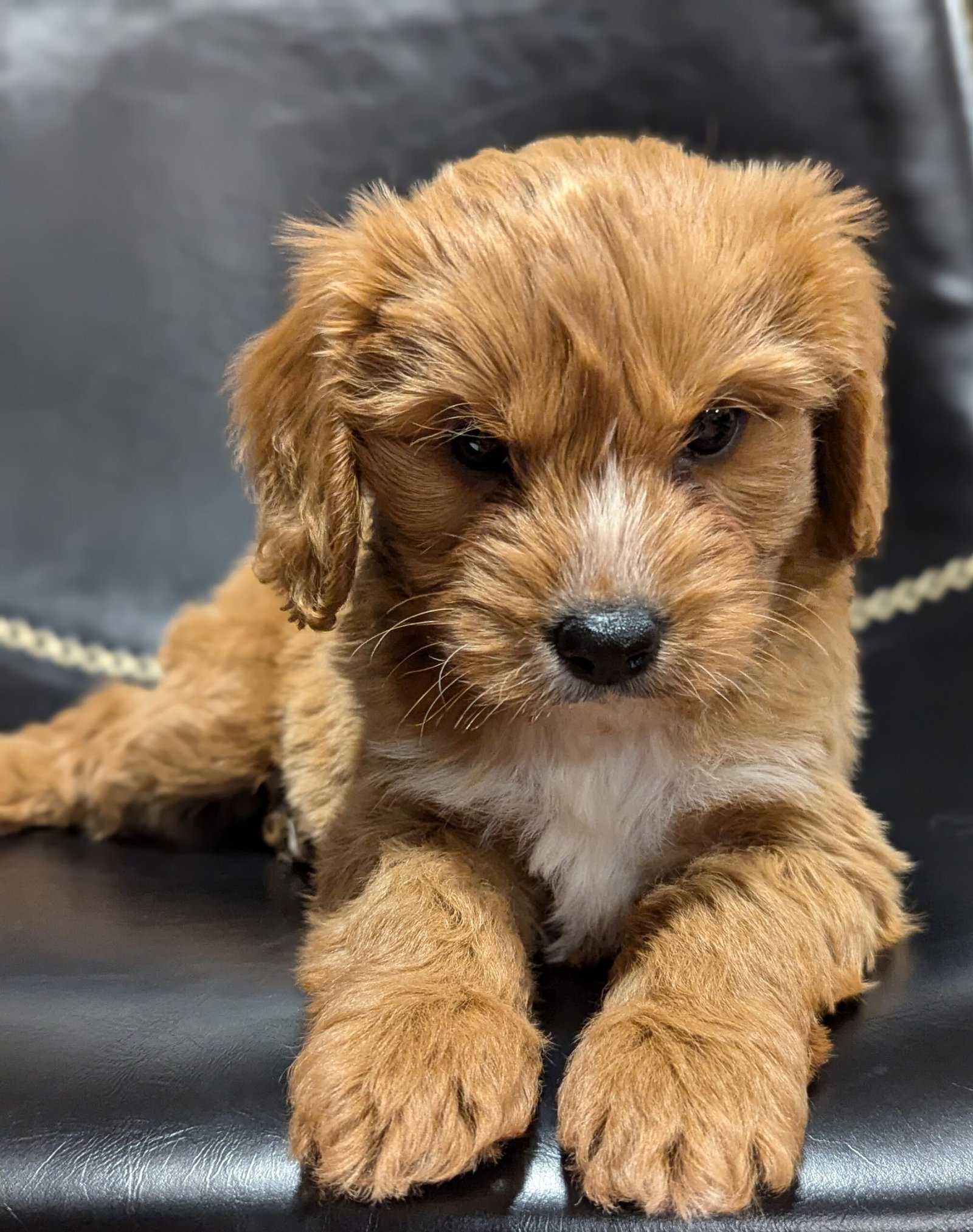 Hi meet Cooper!!! Just in time for thanksgiving!! He is a happy healthy puppy waiting for you to give him lots of love and he loves to be cuddled! Estimated weight is around 16# both parents weighing around 14#. Any questions feel free to call or text, He will be coming home with: